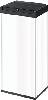 Inhalt 52 l · Deckel und Boden aus hochfestem schwarzem Kunststoff · Gehäuse aus pulverbeschichtetem Stahlblech · zweigeteilter Schwingdeckel schließt selbstständig, Verrastung zum kompletten Öffnen des Schwingdeckels möglich · mit Müllbeutel-Klemmrahmen · Boden mit 4 Anti-Rutsch-Füßen · Lieferung erfolgt zerlegt, einfache Montage