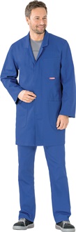 100% Baumwolle, ca. 290 g/m² · individuell für jede Arbeitsstelle · Kragen mit Revers · 2 Seitentaschen · 1 Brusttasche · 1 Innentasche · verdeckte Knopfleiste · Wechselknöpfe · Rückengurt