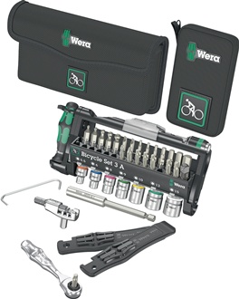 Bestückung abgestimmt für den Service und die Reparatur von Fahrrädern · bestückt mit 22 Bits, Bit-Knarre (Zyklop – Vollstahlausführung mit direkter Bitaufnahme), Bithalter mit Schnellwechselfutter (Rapidaptor Technologie) und 7 gängigen Steckschlüsseleinsätzen 6,3 mm (1/4”) · Inhalt: 1 Handgriff mit magnetischer Bitaufnahme L. 78 mm 1 Zyklop Bit-Knarre L. 87 mm je 1 Steckschlüssel-Einsatz 6,3 mm (1/4”)-Vierkantantrieb SW 5,5 / 6 / 8 / 9 / 10 / 13 / 15 mm 1 Adapter 6,3 mm (1/4”)-Außenvierkant auf 6,3 mm (1/4”)-Außensechskant 1 Kettennieter 1 Kettenfixierhaken 1 Reifenheber mit Bit-Aufnahme 1 Reifenheber mit Ventilausdreher 1 Klettstreifen 50 x 120 mm Bits: für Schlitzschrauben je 1 St. Gr. 4,0 x 0,5 / 4,5 x 0,6 mm* für Schrauben mit Kreuzschlitz (PH) je 1 St. Gr. 1 / 2* für Schrauben mit Innen-TORX®-Profil je 1 St. Gr. T 10 / 15 / 20 / 25 / 27 / 30* für Schrauben mit Innensechskant-Profil je 1 St. Gr. 2 / 2,5 / 3 / 4 / 5 / 6 / 8 mm** für Schrauben mit Innensechskant-Profil je 1 St. Gr. 2,5 / 3 / 4 / 5 / 6 *** 1 Bithalter mit Schnellwechselfutter (Rapidaptor Technologie) – (50 mm) 1 Universalhalter mit Edelstahlhülse für Bits L. 100 mm * zähhart mit Torsionszone ** zähhart mit Hex-Plus Technologie *** zähhart mit Kugelkopf Weitere technische Eigenschaften: · Abrollschutz: ja · Bicycle Set: ja · Bithalter mit Rapidaptor-Schnellwechselfutter: ja · Geeignet für Wera 2go: ja · Gesenkgeschmiedete Vollstahlausführung: ja · Hex-Plus: ja · Kraftform Griff: ja · Kugelkopf: ja · Rostfrei: ja · Take it easy Nuss: ja · Torsionszone: ja · Zyklop Metal Switch: ja