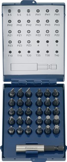 bestückt mit zähharten Bits, und Bithalter · für Hand- und Maschinenbetrieb (konv. Akkuschrauber) Inhalt: 1 Bit-Halter (Ausführung siehe Tabelle) je 1 Bit für Schlitzschrauben Gr. 4,5 / 5,5 / 6,5 mm je 3 Bits für Schrauben mit Kreuzschlitz (PH) Gr. 1 / 2 / 3 je 3 Bits für Schrauben mit Kreuzschlitz (PZD) Gr. 1 / 2 / 3 je 1 Bit für Schrauben mit Innen-TORX®-Profil Gr. T 10 / 15 / 20 / 25 / 30 / 40 je 1 Bit für Schrauben mit Innensechskant-Profil Gr. 4 / 5 / 6 Weitere technische Eigenschaften: · Antrieb: 1/4 “ · Verpackung: in Stahlblechkassette · Antrieb mm: 6,3mm