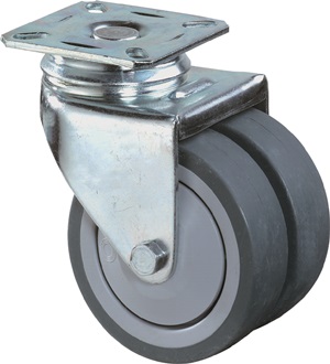 Apparaterolle · Gehäuse aus Stahlblech, verzinkt-chromatiert · korrosionsunempfindlich · zweireihiger Kugelkranz im Gabelkopf · thermoplastische Gummibereifung (grau) · Kunststoff-Radkörper mit Kunststoff-Fadenschutz · Kugellager · mit Plattenbefestigung Weitere technische Eigenschaften: · Befestigungsart: mit Anschraubplatte · Bauhöhe: 102mm · Arbeitstemperatur: -10 – 60°C · Plattenlänge: 77mm
