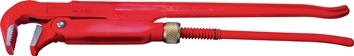 Chrom-Vanadiumstahl, ganzstahl-gesenkgeschmiedet und vergütet, mit verstärkter Hülse, geschliffenen Backen · Halten und Drehen von verschiedensten Rohrarten im Bereich Ø 1″ – 4″ · günstiges Eckmaß: Schlankes Maul sowie schmale Backen · robust: Ganzstahl-gesenkgeschmiedeter Körper für eine hohe Langlebigkeit · versetzte Verzahnung: Sicheres und rutschfestes Greifen, auch gegen die Drehrichtung Weitere technische Eigenschaften: · Gewicht: 2400g · Farbe: rot · Material: Chrom-Vanadium-Stahl · Modell: Kopf 90° abgewinkelt