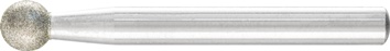 Kugelform · galvanisch gebundenes Diamantwerkzeug · zum Gravieren, Schleifen von Konturen und Entgraten geeignet · zur Bearbeitung von Hartmetall, Glas, Keramik, Porzellan, feuerfesten Werkstoffen, Ferrit, Silicium, Graphit, Gummi usw. · die Kugelform wird häufig im handgeführten Einsatz genutzt · empfohlene Umfangsgeschwindigkeit Vc = Trockenschliff 8 – 18 m/s Nassschliff 15 – 25 m/s