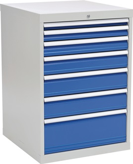 Gehäuse · Präzise Konstruktion aus hochwertigem Stahlblech · Gehäuse mit Rahmenverstärkung · Gesamttragfähigkeit 1500 kg Schubladen · Leichtgängige Schubladenführungen für maximalen Komfort mit 100 % Vollauszug · mit absoluter Einzelauszugsperre und Zentralverschluss, ein Kippen des Schrankes nach vorne ist ausgeschlossen · Innen liegende Aluminium-Griffleisten vermindern die Verletzungsgefahr durch hängenbleiben · Optimale Kennzeichnung durch Beschriftungsstreifen mit Klarsichtabdeckung · Geschlitzte Seitenwände bieten zahlreiche Möglichkeiten für individuelle Unterteilungen Lackierung · Alle Schubladenschränke werden mit einer hochwertigen und robusten Pulverbeschichtung (Strukturlack) geliefert Weitere technische Eigenschaften: · Schubladeninnenbreite: 600mm · Schubladeninnentiefe: 600mm