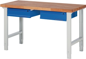 Komplettangebot · einfache Selbstmontage · massive Buchenholzplatte Stärke 40 mm, mit beidseitigem Deckfurnier · Ausführung mit 2 Hängeschubladen H 150 mm, Innenmaße B 490 x T 560 mm, enzianblau, RAL 5010, abschließbar mit Zylinderschloß